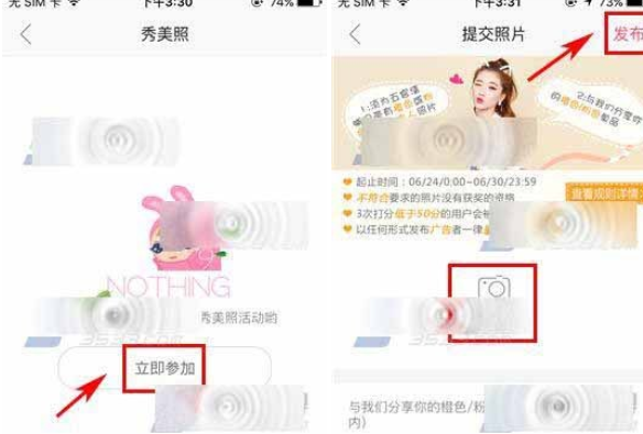 2)点击【可以参加】,然后点击上传自己的美照,最后点击右上角的【发布】。 (如下所示)