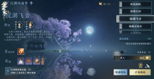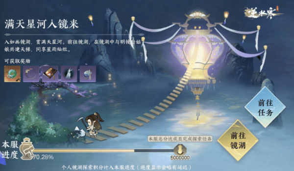 同时,所有玩家进入镜湖后会自动接“星辰入镜”任务,并与npc【镜台】一起寻找材料,搭起天梯,共享星辰雨露的辉煌。
