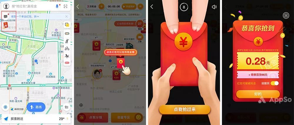 另外,高德APP里还有抢红包的小游戏。点击应用首页左上角的红包按钮或活动链接,即可在地图上查看其他用户的红包。点击对应红包,10秒内戳屏。有可能“抢”对方的红包,也可能出现类似“红包雨”的游戏。除现金外,还可能随机发放口碑红包等优惠券。现金红包要到10月1日20:00才能提现到支付宝,期间随时可能被其他用户抢走……