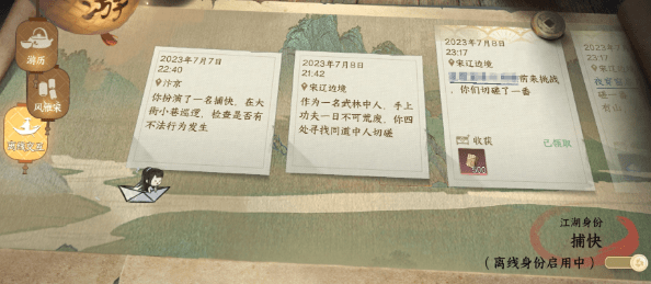 答:这其实就是我们旅游中的“线下互动”。你下线后,你的角色会继续按照你的身份在呼吸江湖中游走,走来走去,遇到其他NPC或玩家,有各种故事。可以去旅行-离线互动看看你的角色在离线期间经历了什么,获得一些奖励!