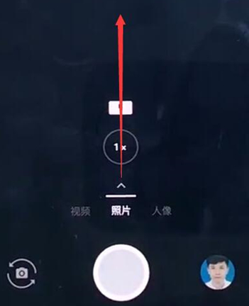 第二步:进入拍照界面后,从箭头标记处向上滑动,直至出现更多功能选项。