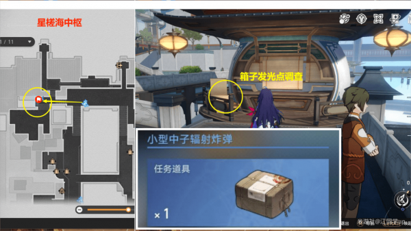 (1)首先检查你的任务背包,看是否有物品【小型中子辐射弹】。如果没有,先去下图的【星查海中心】位置,然后【调查】箱子的发光点,获得任务物品。
