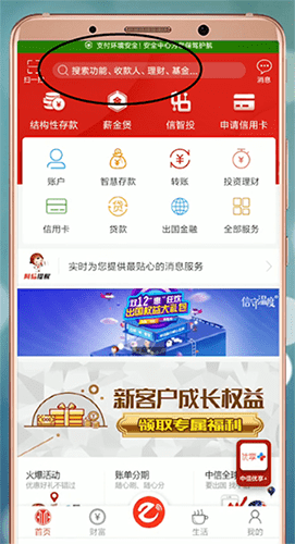 打开手机上的【中信银行】APP,在主页顶部搜索栏中点击输入搜索