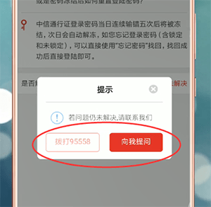 在弹出的提示栏中,两种方法都可以找到手动服务。我们可以根据语音提示点击【拨打95558】查找电话人工服务,或者点击【向我提问】。到