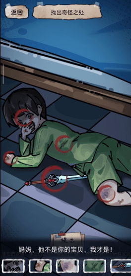 2.在床下的图片中找出五个关键线索和物品。玩具剑在孩子下面,所以我们需要把它滑出。