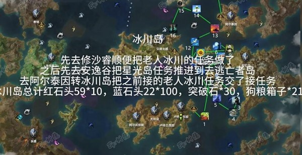 先是去沙瑞完成老人冰川的任务,然后去舒适谷把星岛的任务推到逃亡者岛,红石,蓝石,突破石,狗粮箱。