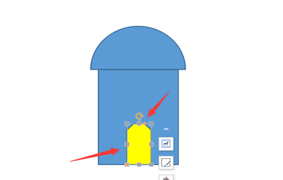3、利用形状中的【剪出同侧角的矩形】画出一扇小门,放置在如下图所示的位置。作为磨坊的门,这个【同边切角的矩形】上的角是可以调整的,如下图所示。同时,将此门的颜色设置为【黄色】。到