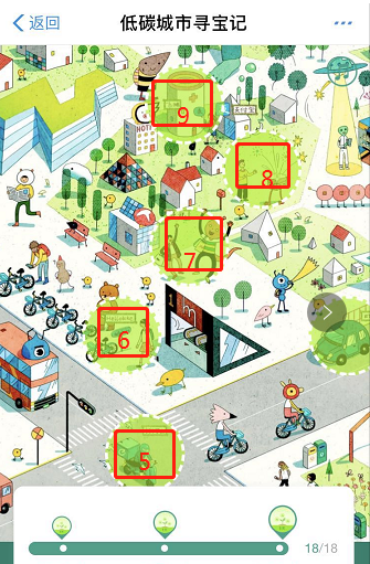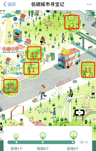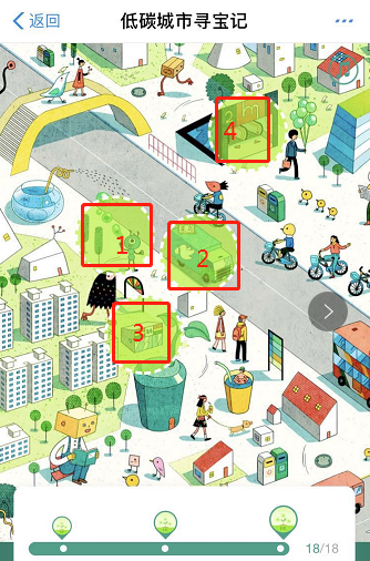 进入“低碳城市寻宝”活动界面后,用户需要仔细识别图片上的各个场景,点击以下图片标识,然后解锁对应的场景。到