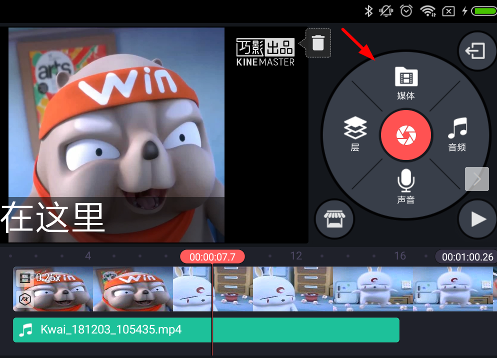 2、然后找到编辑页面右侧的菜单列表,通过“媒体”功能打开手机本地相册,添加需要编辑的视频素材。到