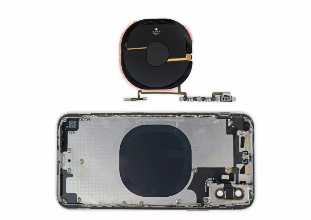 iPhone X 内部的无线充电线圈。图片来自:iFixit
