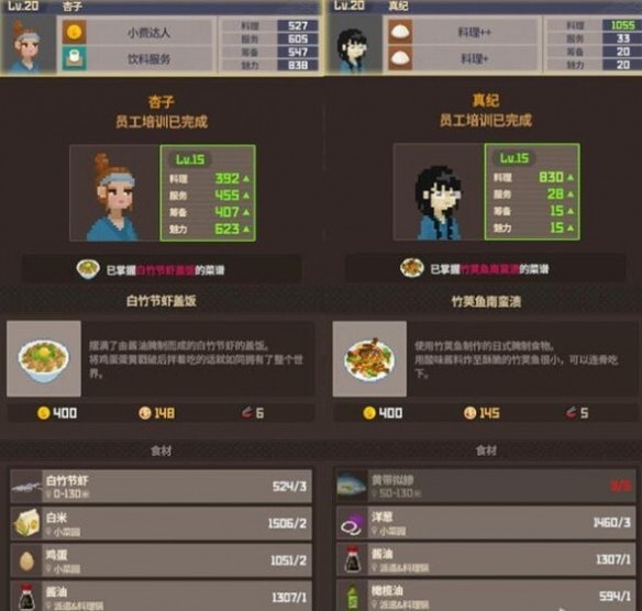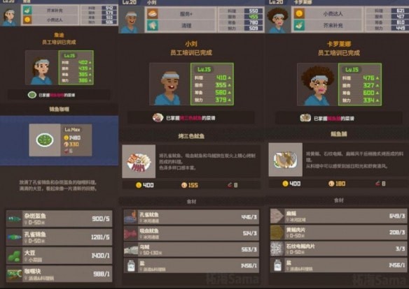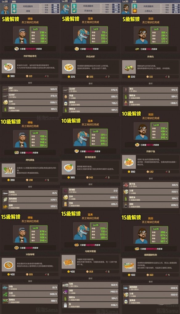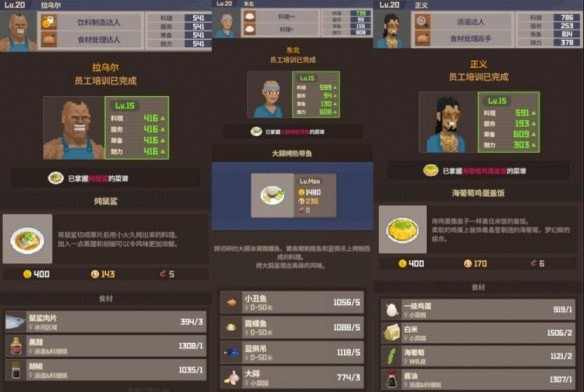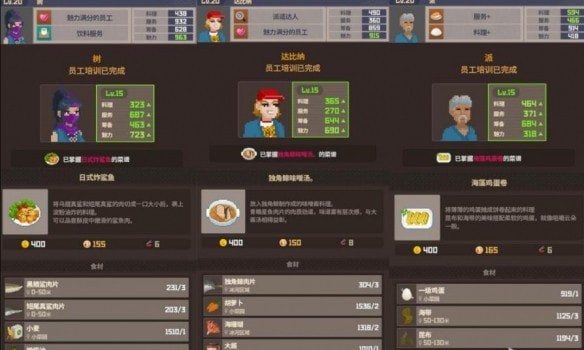人员机制所有员工3级解锁第一技能,7级解锁第二技能,15级解锁专属菜单,20级解锁完全等级。