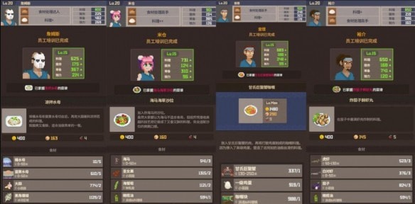 员工属性的烹饪、服务、准备、魅力分别影响员工相应行为的属性,分为厨房、大堂、经理三个部分。
