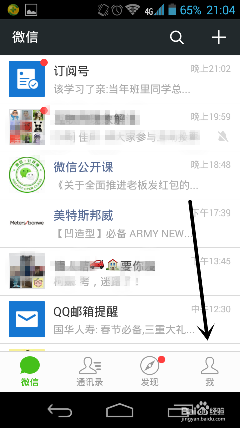 第二步,成功登录微信后,你会看到四个界面,一个是微信,一个是通讯录,一个是发现,最后一个是我。此时选择该界面。