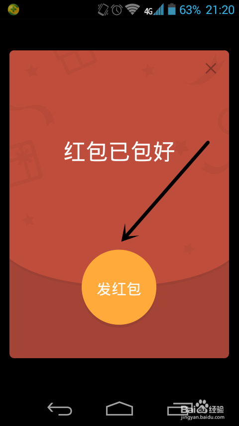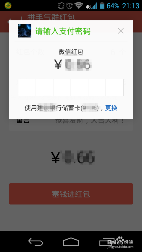 第六步:输入红包后,使用小额支付存入红包。输入密码,支付成功,红包已包好。选择要发送的对象,确认对象后,单击“发送”。这样,红包就会到达你要发的人那里,他们就会抢你的红包。