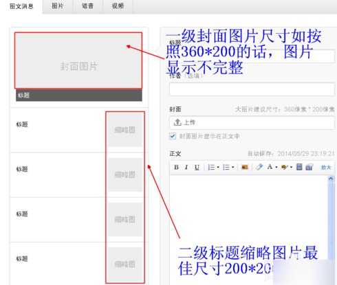 2、一般上传的封面图片,官方推荐的图片尺寸为360*200像素,但在手机微信上显示的图片会被标题部分遮挡。 】多图多文字的二级缩略图以正方形显示,因此图片的最佳尺寸为200*200,或者宽度和高度应等于不大于500。