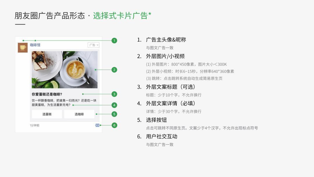 朋友圈广告产品的形式主要是图片+文字和图片+视频,属于常规广告。还有基础卡牌广告、评选卡广告、投票卡广告,其中还有@广告主评论、广告主回复、@好友等功能!后两种卡片式广告需要预定。单次投放最低金额为100万可供选择,每次需单独申请。