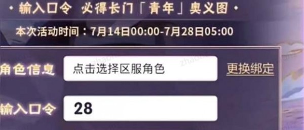 2.选择自己的服务信息并绑定角色,然后输入密码【28】,点击兑换即可获得青春长门奥义书。