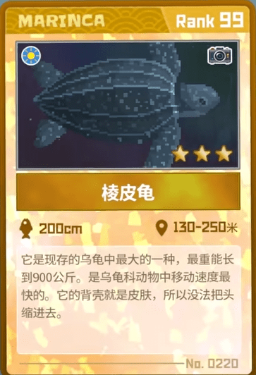 捕捉方法:在蓝洞深海遇到棱皮龟后,摸摸它的尾巴让它平静下来,然后按下拍照快门。