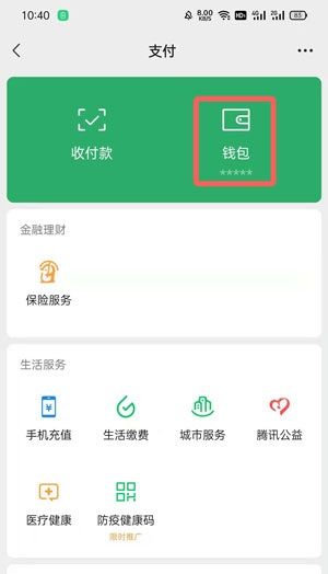 第二步:点击支付中的【钱包】,进入并管理您的钱包及各类绑定卡;