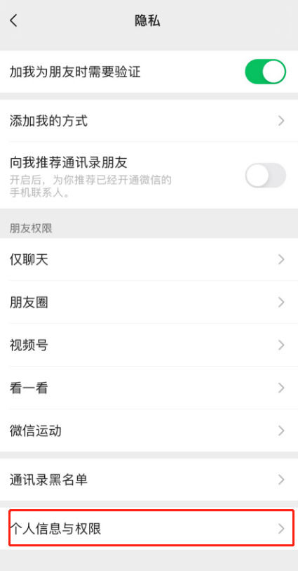 1. 打开微信我的页面,在“设置”中选择“隐私”。在隐私部分的底部,您可以看到新的个人信息和权限选项。