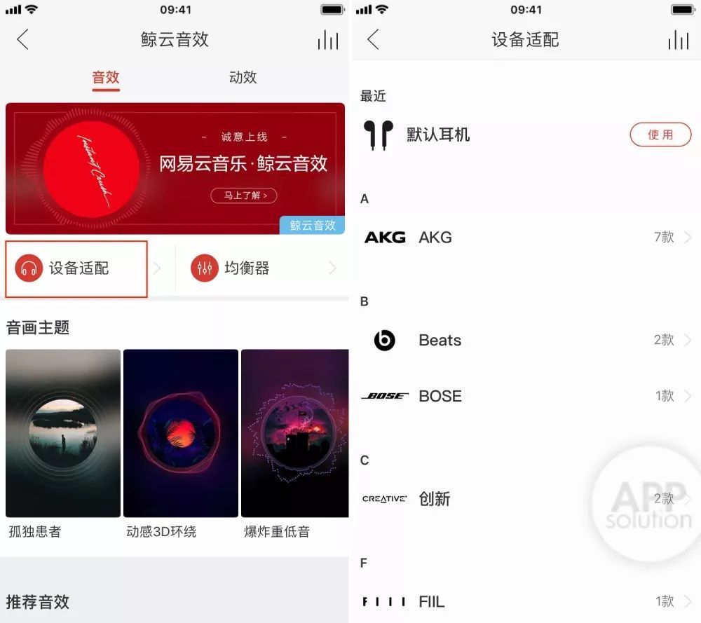 打开“鲸云音效”后,首先“设备适配”。为了更好地适配用户的耳机,网易云音乐还针对Beats、Bose、Sony等品牌设备推出了50多种设备音效。用户可以在“设备适配”中找到自己的耳机型号,并使用“专属”音效。如果没有匹配的耳机,那么只需选择使用“默认耳机”即可体验非专属音效。