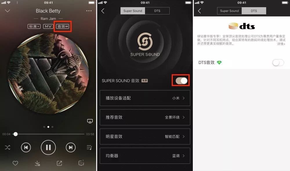 事实上,另一主流音乐播放器已经具备类似功能。在QQ音乐中,用户可以直接点击播放界面的“音效”进入设置页面,选择自己喜欢的音效。其中Super Sound为免费音效,而DTS音效为绿钻用户专属。