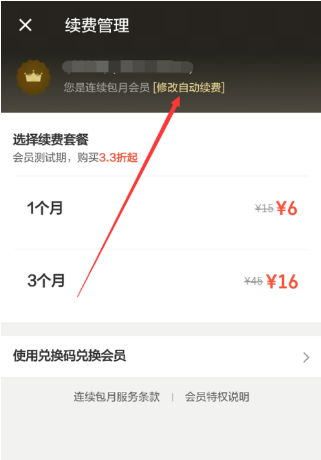 3、这样,在页面中选择“修改自动续订”功能,点击“取消连续包月”选项即可成功取消自动续订。