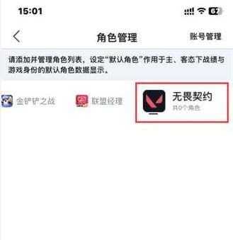 2.然后在记录查询页面选择[+]按钮查看角色管理页面,选择无畏契约账号和对应的角色进行绑定;