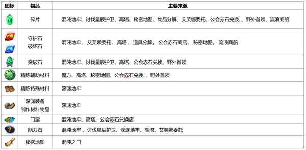 主要获取地点:物品分解、混乱地下城、场主战斗、交易银行等。