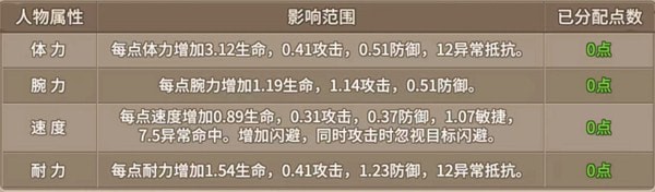 速度,耐力,腕力,体力等四个方面,每提升一次都可以获得相应的属性加成,只是属性加成不同而已。比如玩家分发一点体力,可以增加3.12点生命值,0.41点攻击力,0.51点防御力,12点异常抗性属性。如果玩家被分配到耐力,可以增加生命,攻击,防御和异常抗性。具体加成属性如下,可以作为玩家加分的参考: