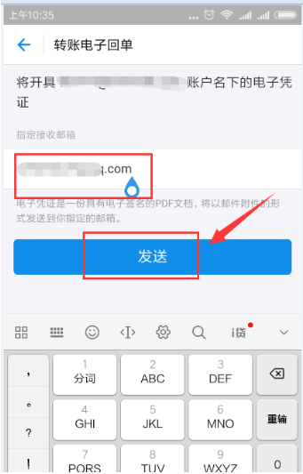 1. 转账成功后,输入账单详情,点击下方“申请电子收据”,如图箭头所示。