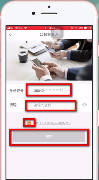 2、进入公积金查询页面,在页面输入您的【身份证号】和【对应密码】,点击下方同意按钮【勾选】,完成上述步骤后,点击【提交】即可查看到您的公积金查询页面。公积金