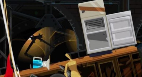 9.然后用折叠床快速到达右上方的铁球位置,滚动打开冰箱拿到搅拌机。