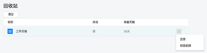 此外,腾讯文档还新增了回收站功能,并将其放置在界面左侧。用户删除的内容将在回收站保存30天,过期后将自动清除。当然,您也可以恢复或完全删除回收站中的文档。这个新功能的主要作用应该是给用户一剂后悔药,避免误删重要文件。