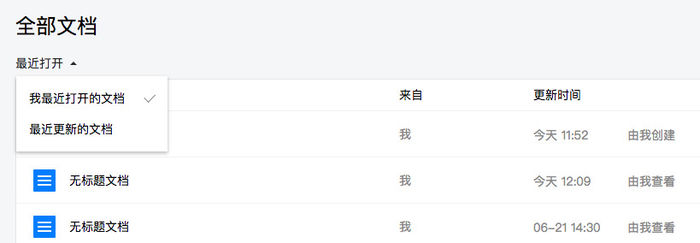 另外,在本次更新中,腾讯文档带来了“我最近打开的文档”和“最近更新的文档”两种排序方式。对于强迫症来说,最好按照最新更新时间排序,否则不小心打开的文档就会排到文件列表的顶部。