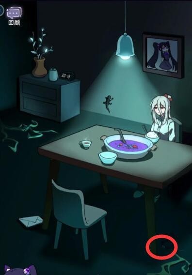 图片右下角的桌子下面,有一个小眼睛,玩家点击就能找到。