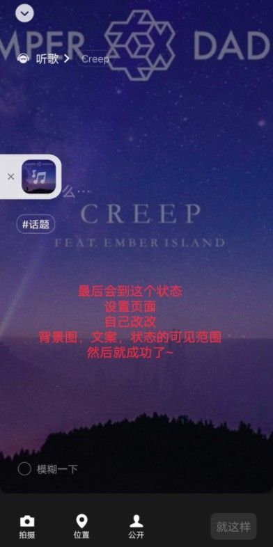 5、然后会自动跳转到状态页面更改文案、背景图、状态权限等(此时歌曲已成功分享);