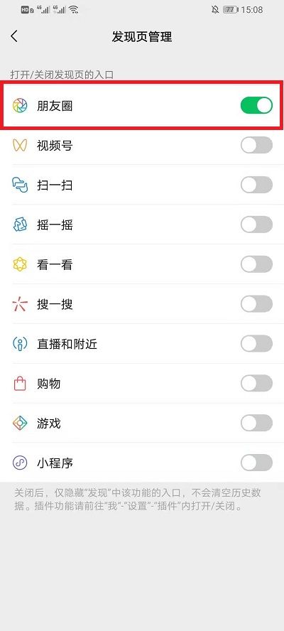 5、在【发现页面管理】界面中,我们可以点击朋友圈后面的按钮,让朋友圈重新出现。