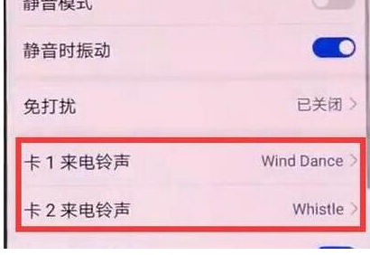 第三步:点击【来电铃声】进行设置。如果有两张卡,则此处显示卡1和卡2的铃声。单击,选择需要设置铃声的卡。