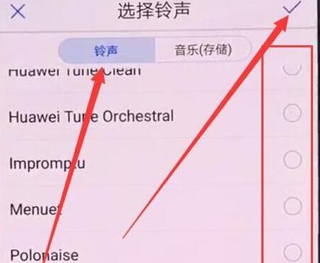 步骤5:点击屏幕上方的【音乐(存储)】将您下载的音乐设置为铃声,点击选择一首音乐,然后点击右上角的对号确认。到