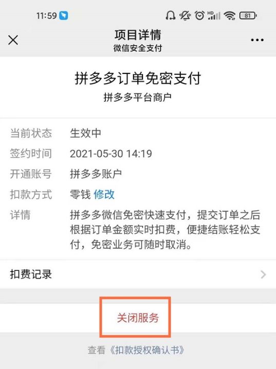 4. 点击需要取消的扣款授权服务。进入后点击关闭服务。