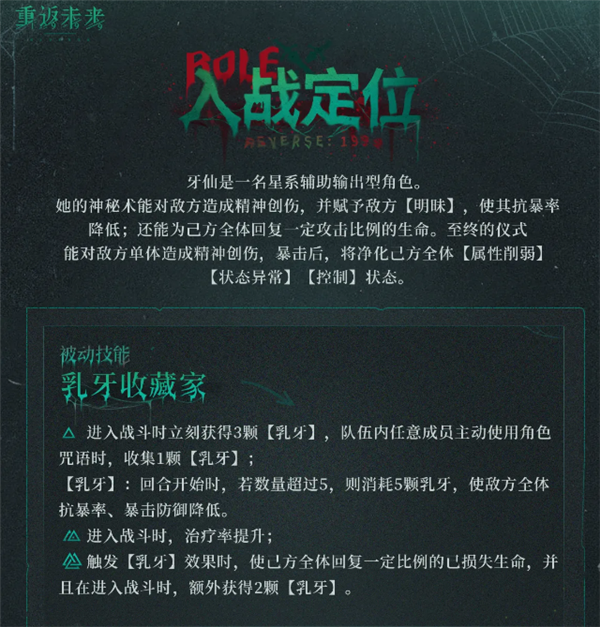 【决战乳牙】:回合开始时,如果数量超过5颗,则会消耗5颗乳牙,降低全体敌人的暴击抗率和暴击防御。