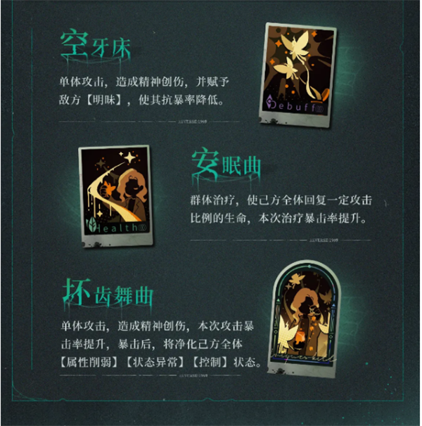 她的神秘功法可以对敌人造成精神创伤,并赋予敌人【光明】,降低对暴力的抵抗率;它还可以为所有敌人恢复一定比例的攻击生命。最后的仪式可以对单个敌人造成精神创伤。暴击后,将净化所有处于【属性弱化】【异常状态】【控制】状态的友军。