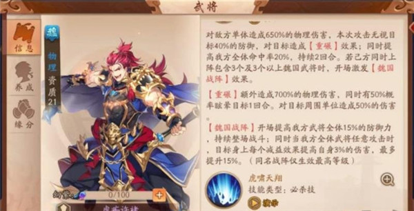 许褚的特点是可以无视敌人的防御并反弹自己受到的debuff。他的第一个技能是猛虎暴击,可以对特定敌人造成巨大的物理攻击。如果对手的生命值超过一半,那么造成的额外伤害将会翻倍。第二个是猛虎之力,依然是单独攻击对面中间的人,不过这个技能的攻击有一定的破甲效果,会严重碾压他。同时我方所有人的命中都会及时增加两个单位。如果我们场上同时有三个或更多魏人,我们一开始就可以获得魏营的加成。重磨的效果是对其他人造成多次额外的物理伤害,同时可以使他100%眩晕一轮。这种伤害也会对站在他附近的人造成强大的影响。如果对方恰好被控制,那么我们也可以把这次攻击的血吸回来,给自己喝一杯。