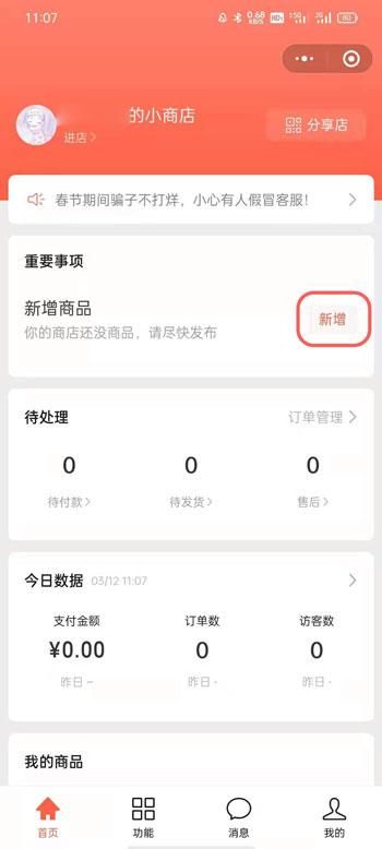 2、进入我的店铺后,点击【首页】顶部的【添加】按钮,添加自己的商品;