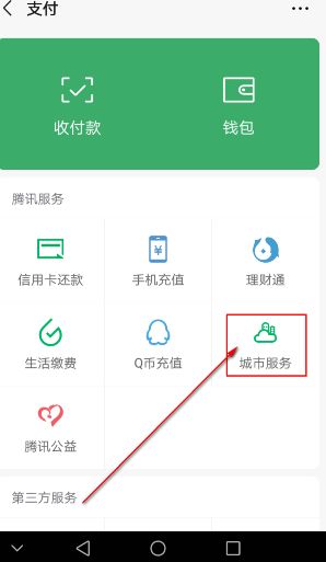 3、点击进入支付后,我们可以在支付功能界面看到“城市服务”项,然后我们需要点击找到查询的入口。
