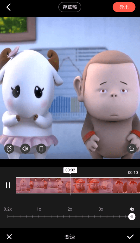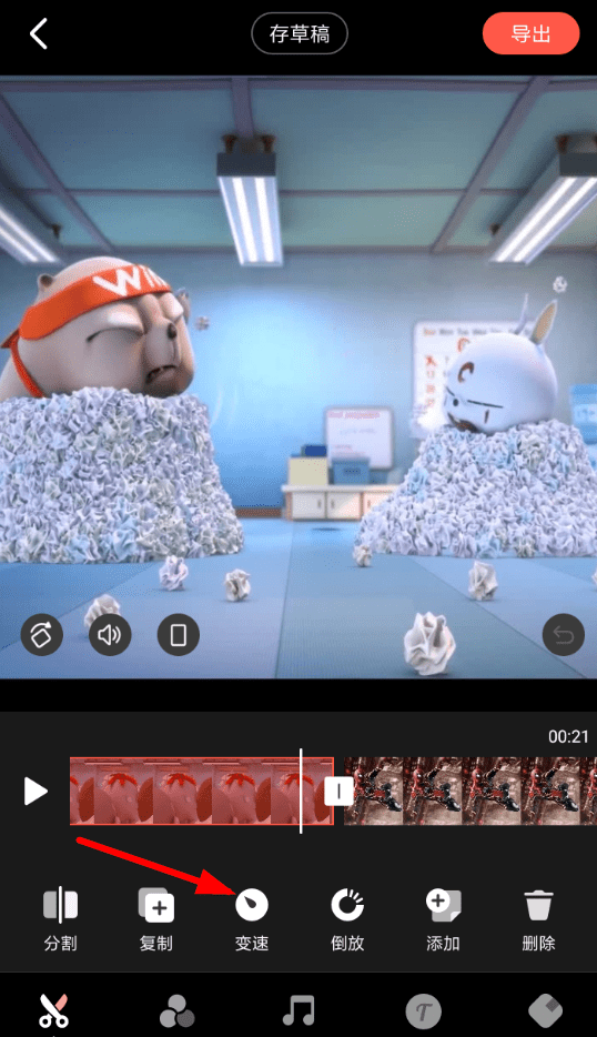 2、进入视频编辑页面后,您可以直接在下方功能列表中找到“变速”功能,为当前选中的视频设置加速和减速效果。到