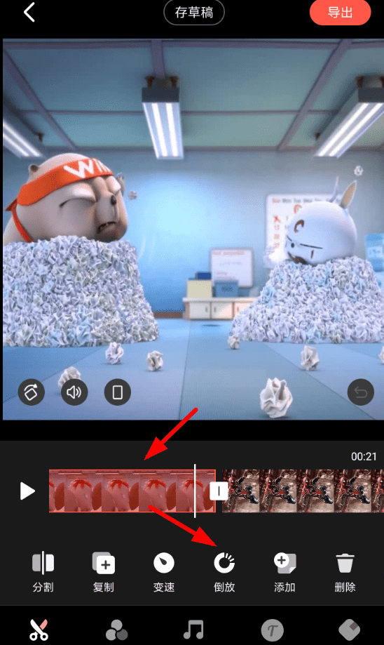 2、然后在视频编辑页面的编辑功能列表中选择“反转”效果,为当前选中的视频设置反转效果。到