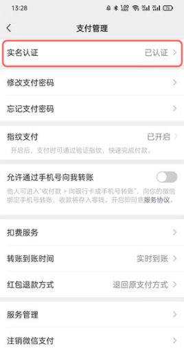 3、然后在支付管理中选择【实名认证】项,进入查看并修改实名认证信息;
