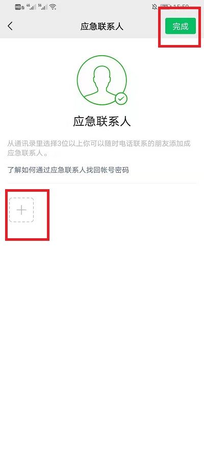 5. 在【紧急联系人】功能界面中,点击下方【+】,进入联系人选择界面。完成选择后,点击右上角【完成】即可完成添加。